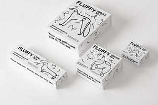 Bao bì của “FLUFFY” salon lấy cảm hứng từ quá trình chăm sóc lông chó, kết hợp minh họa nét vẽ liên tục và bảng màu đen trắng tối giản để tôn vinh cá…